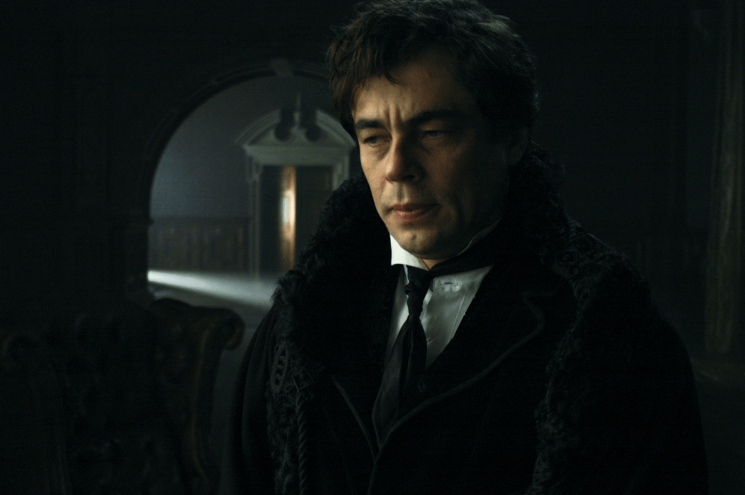 These make up and wardrobe test stills were shot in the unfinished Talbot Hall set designed by Rick Heinrichs. The previous post showed Benicio in a wardrobe choice for a small scene where he plays Hamlet on the London stage. I’ll find a frame grab from that scene later, and you’ll see they ultimately made a different wardrobe choice. This is Emily Blunt in a proposed look for a funeral scene for her fiancée, Lawrence Talbot’s brother. I don’t think you can ever go wrong with black net over a woman’s face. Emily is an extremely nice person, very easy to work with and works in any sort of light really. In fact, she’s one of those actresses where, if you just get light close to her, she will manage to light herself from within. My job was quite easy when she was around.