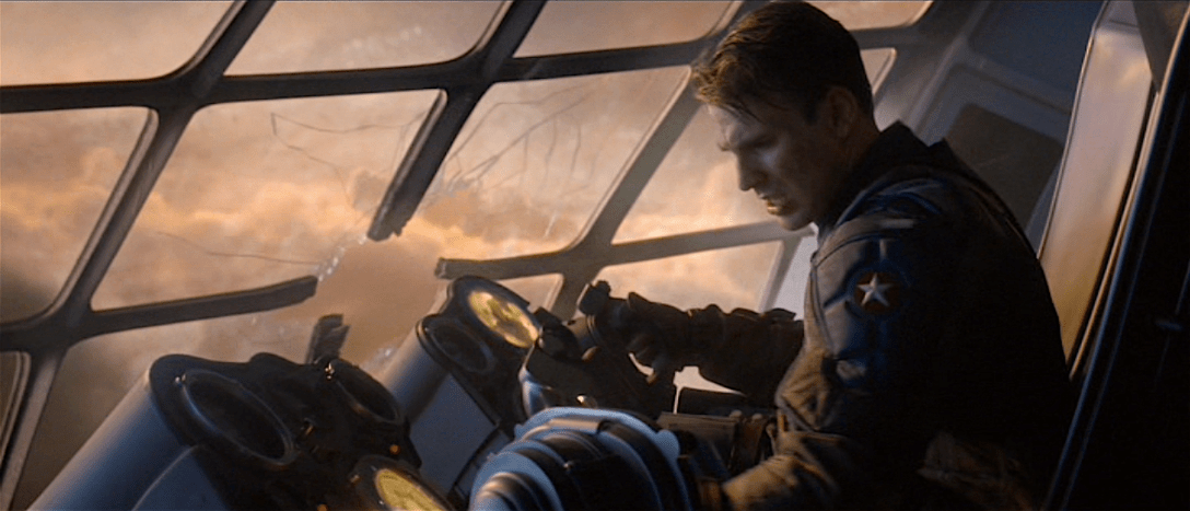 I had the idea of playing the changing light on Chris’s face as though the Suborbital Bomber was flying amongst clouds. This hopefully would have conveyed some sort of feeling of speed, which is good considering we could see no windows looking back into a set that was the size of a flying small ballroom. My general rule of thumb for any process flying sequence is to unlock anything and everything… all axis on the camera, all lights and any camera mountings. Therefore, we had a moving sun, moving clouds, a camera that could move in, out, left, right and up & down. Never locking pan or tilt so that it was free to float independent of anything else.